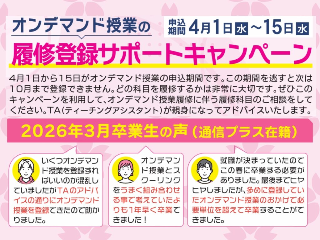 4月1日から15日がオンデマンド授業の申込期間。この時期を逃すと次は10月まで登録できません。